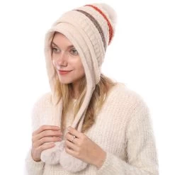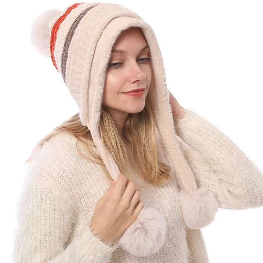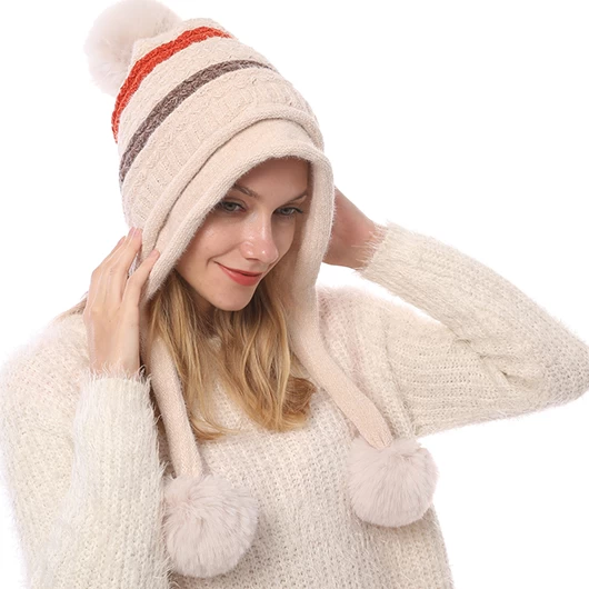 Beige Striped Plush Geometric Knitted Hat