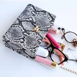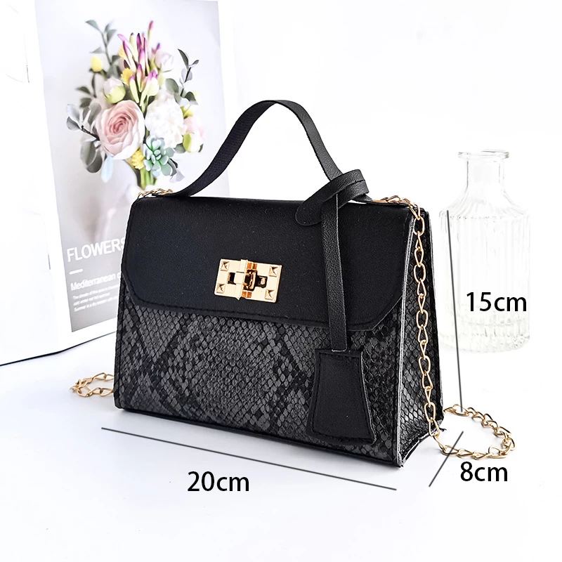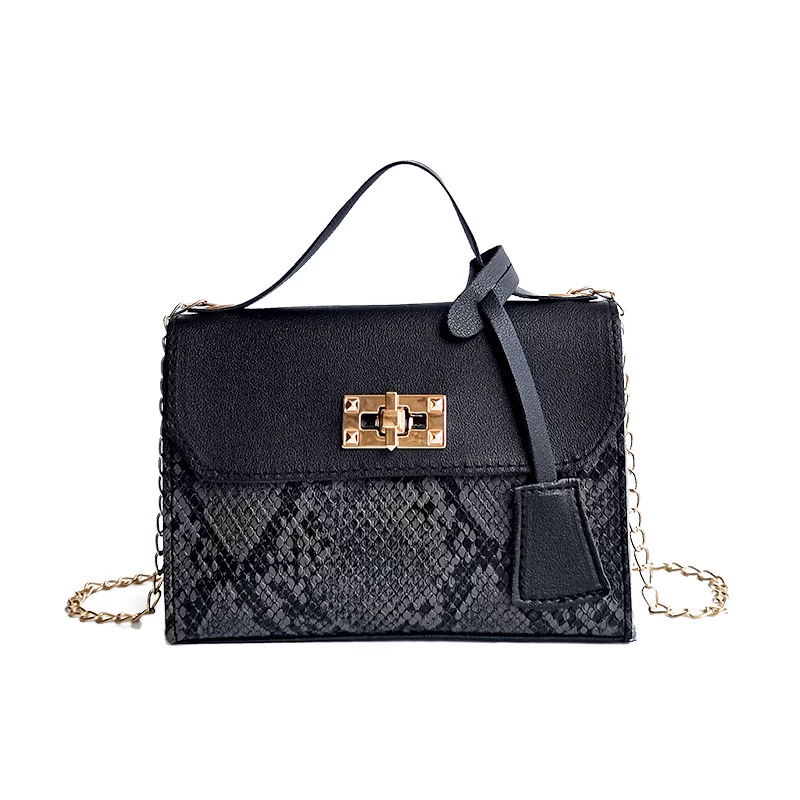 Black Snakeskin Print Turnlock Chains Crossbody Bag