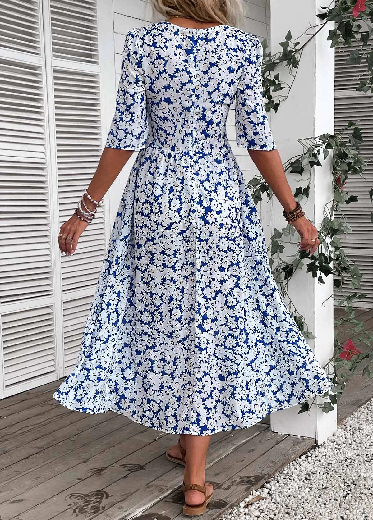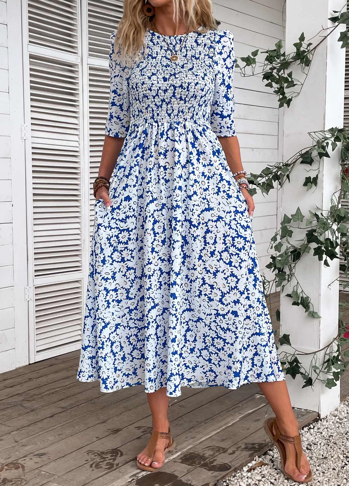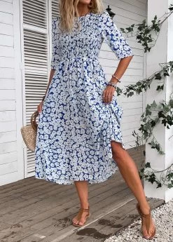 Blue Smocked Ditsy Floral Print Half Sleeve Dress