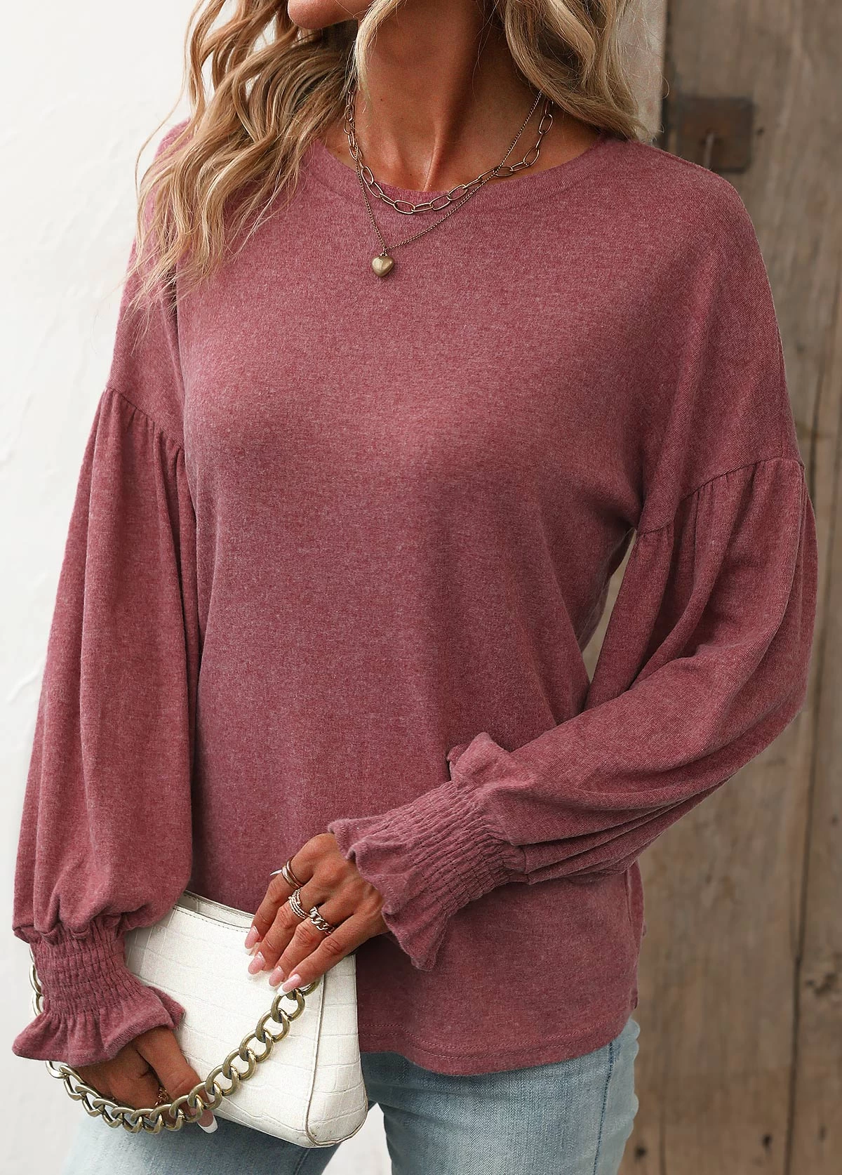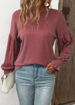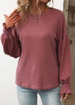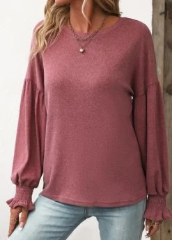 Coral Smocked Long Sleeve Round Neck T Shirt