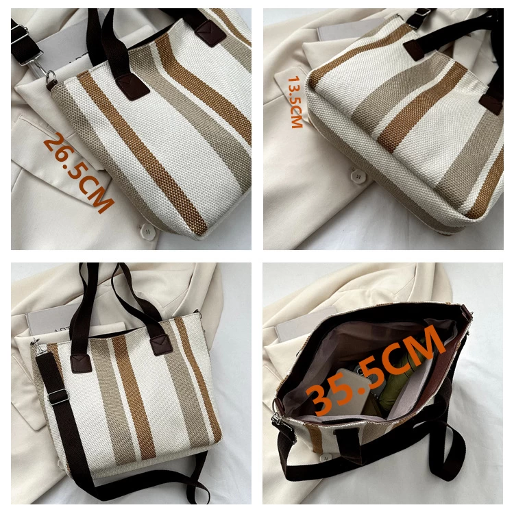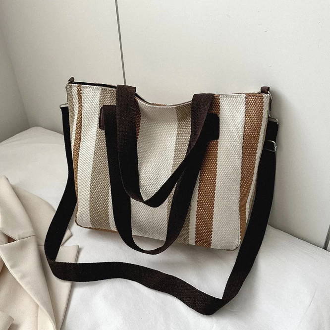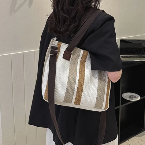 Cotton Blend Beige Clasp Shoulder Tote Bag