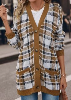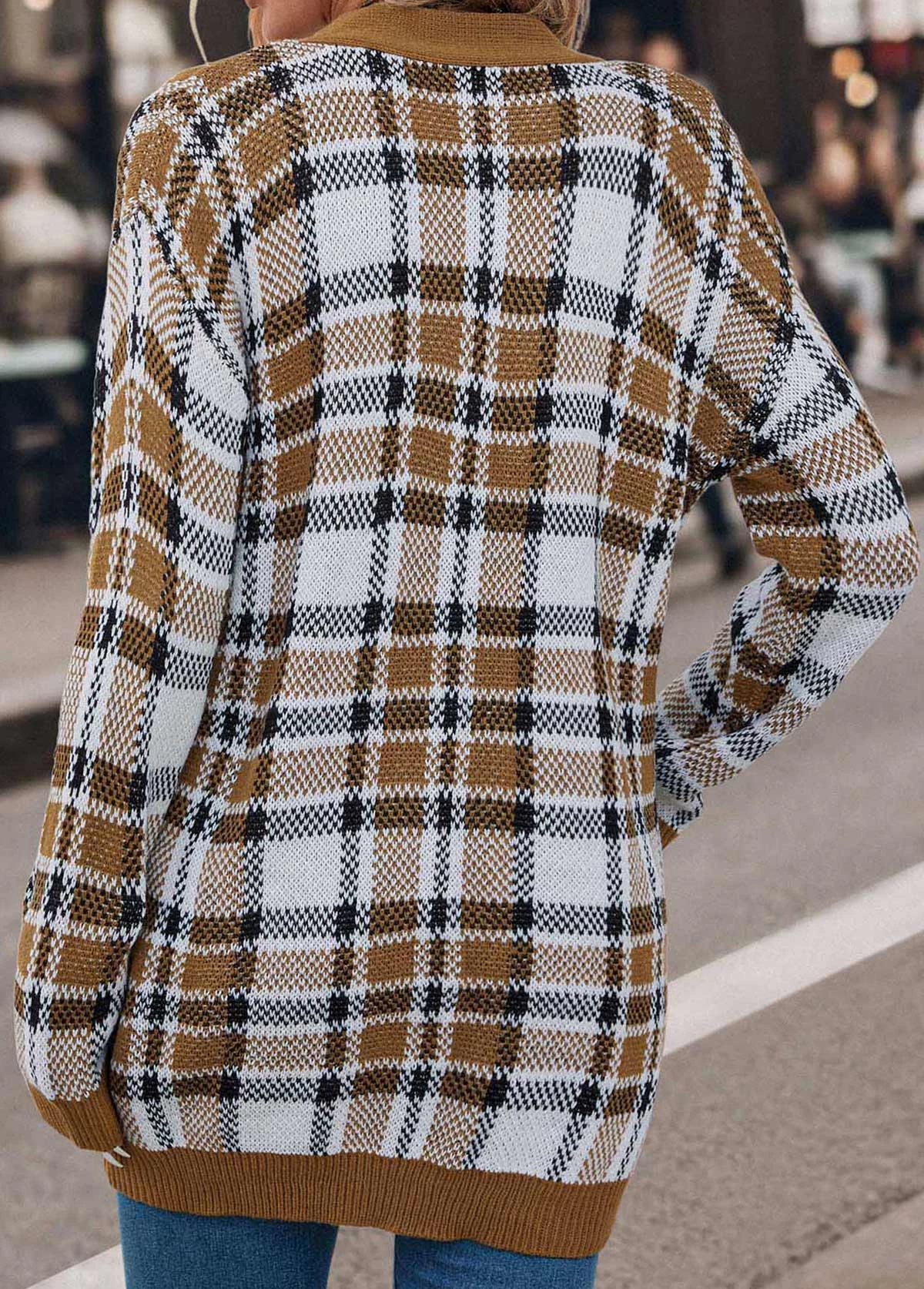 Dark Camel Pocket Plaid Long Sleeve Cardigan