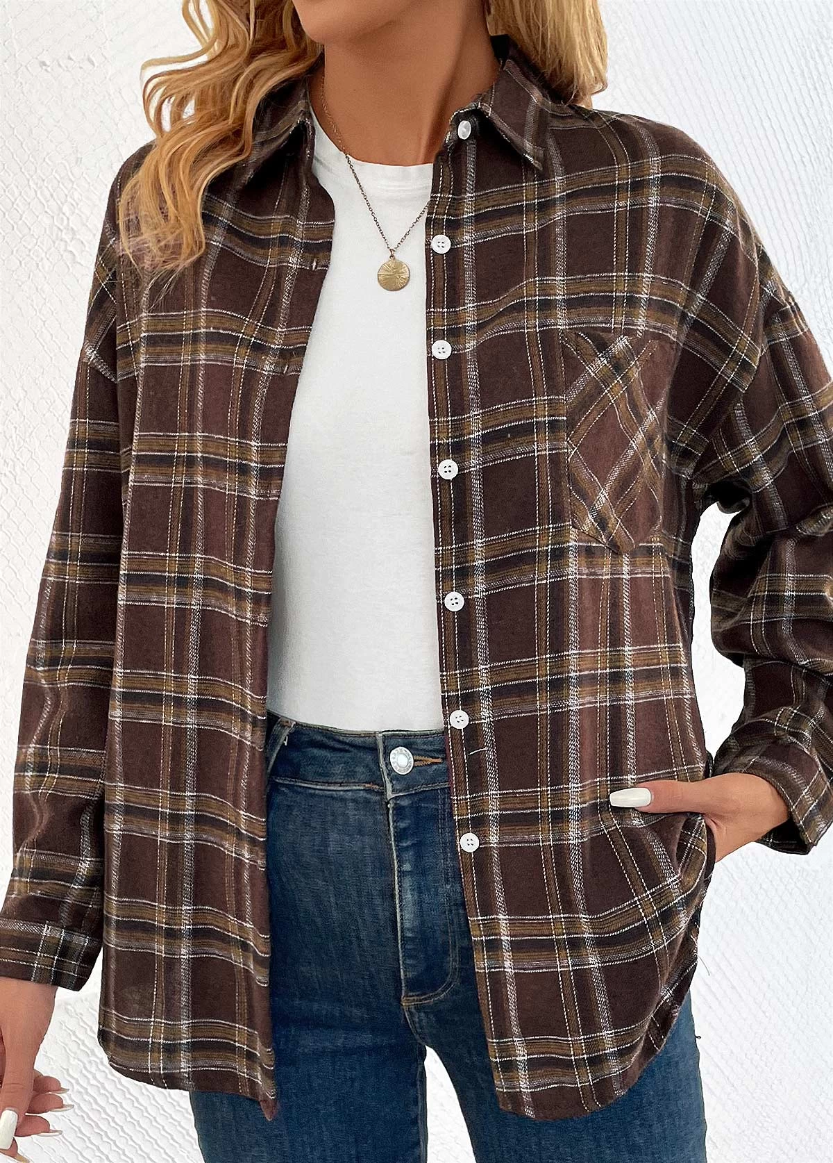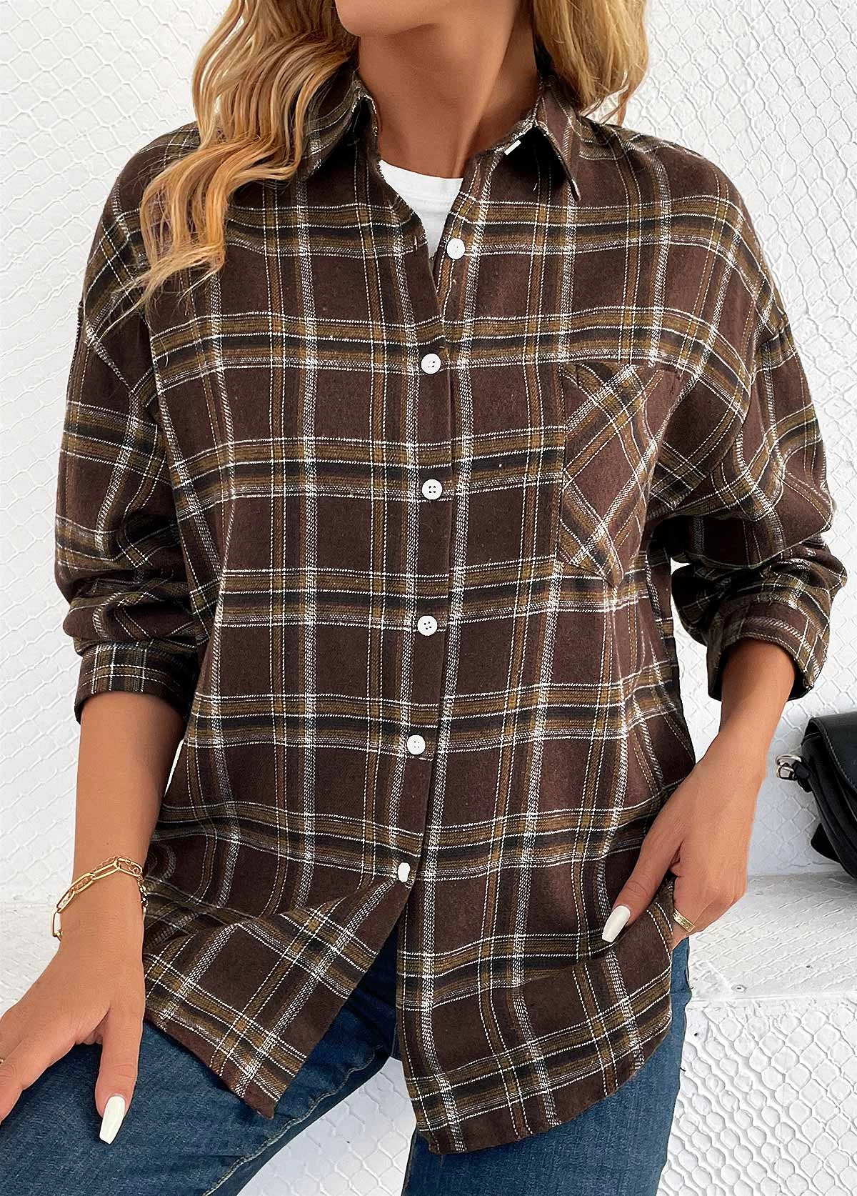 Dark Coffee Button Plaid Shirt Collar Blouse