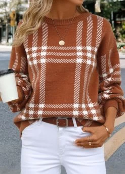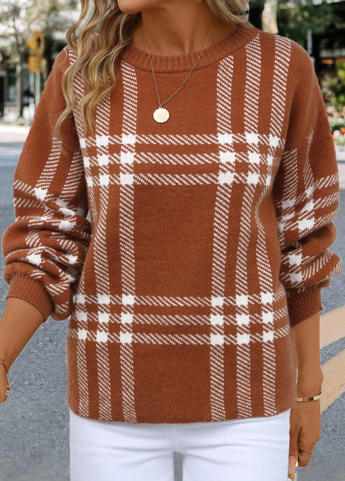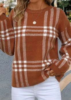 Dark Coffee Patchwork Plaid Long Sleeve Round Neck Sweater