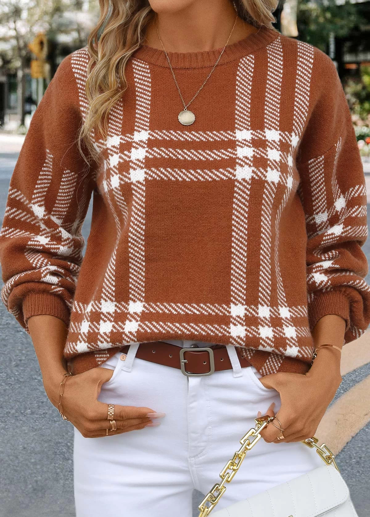 Be the first to review “Dark Coffee Patchwork Plaid Long Sleeve Round Neck Sweater” Cancel reply