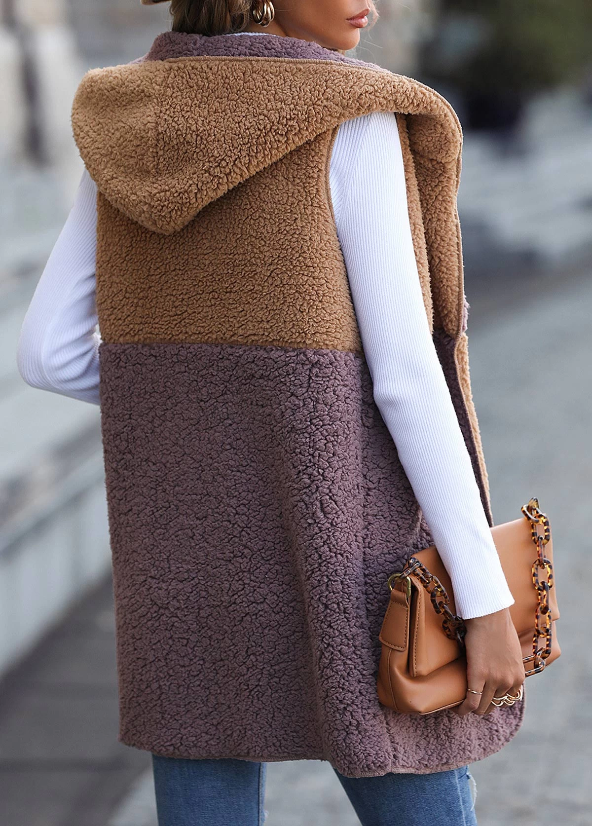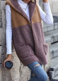 Dark Reddish Purple Patchwork Sleeveless Hooded Waistcoat