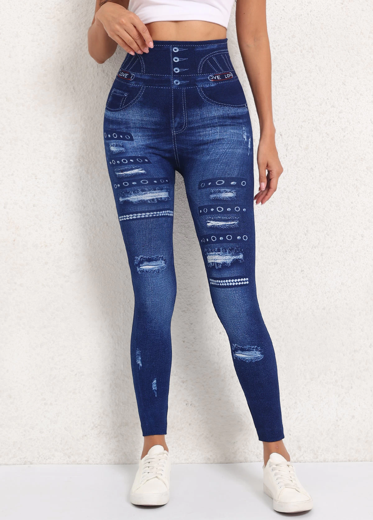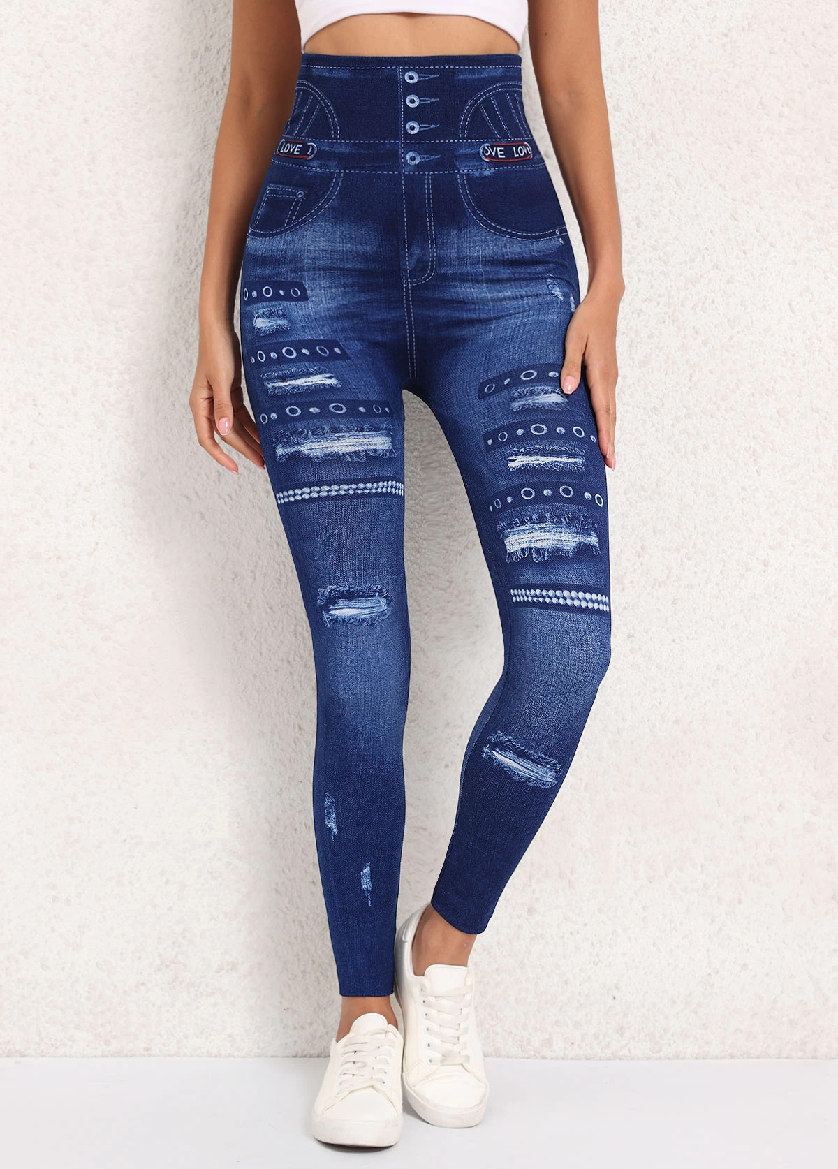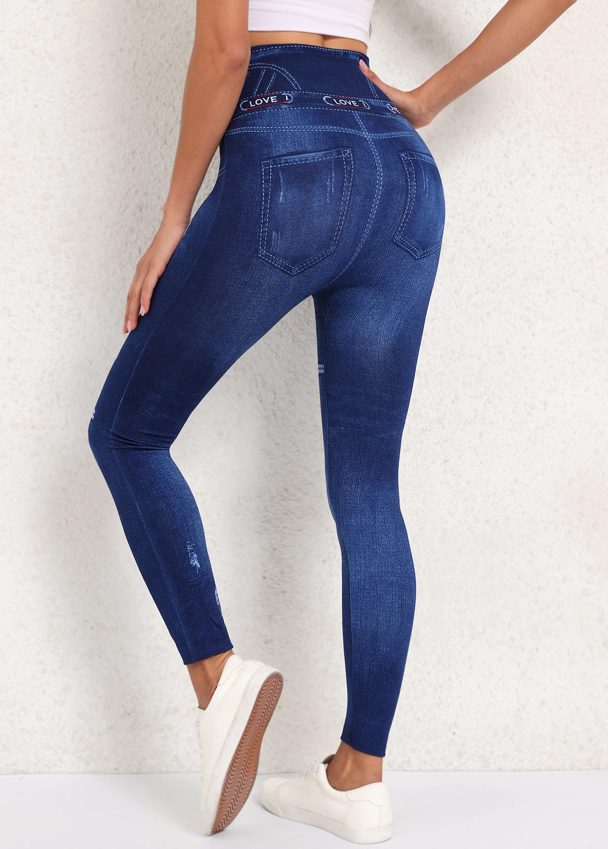 Denim Blue Denim-effect Print High Waisted Ankle Length Leggings