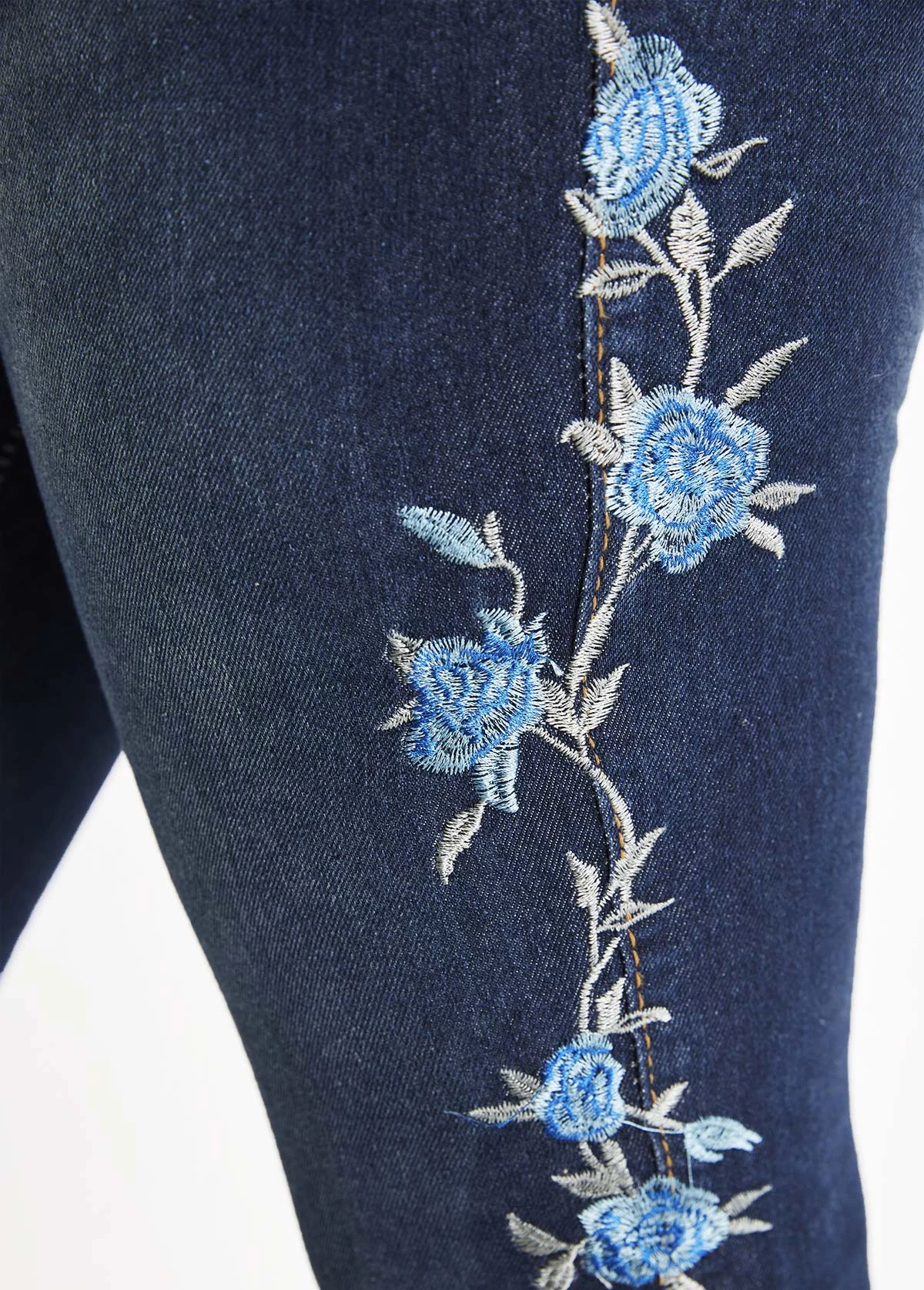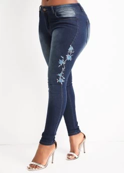 Denim Blue Embroidery Floral Print Skinny Zipper Fly Jeans