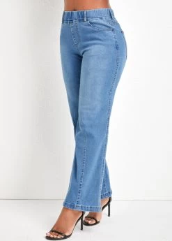 Denim Blue Pocket Flare Leg Elastic Waist Jeans