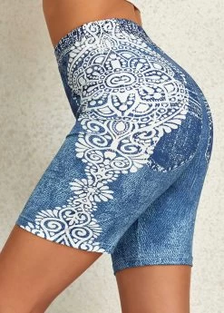 Denim Blue Tribal Print Skinny Elastic Waist Shorts