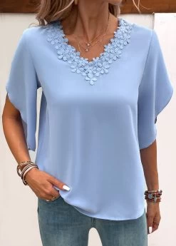 Dusty Blue Patchwork Half Sleeve V Neck Blouse