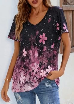 Floral Print Pink V Neck T Shirt