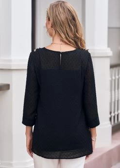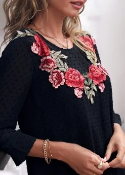 Flower Applique 3/4 Sleeve Round Neck Black Blouse