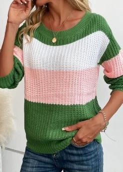 Green Patchwork Striped Long Sleeve Round Neck Sweater