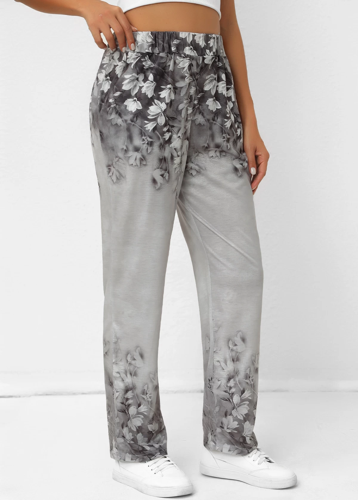 Grey Pocket Random Floral Print Elastic Waist Pants