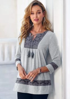 Lace Panel Grey 3/4 Sleeve Tassel Blouse