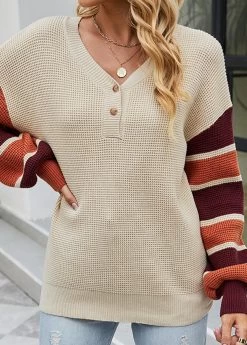 Be the first to review “Light Camel Button Striped Long Sleeve V Neck Sweater” Cancel reply