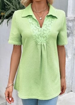 Light Green Patchwork Short Sleeve Shirt Collar Blouse