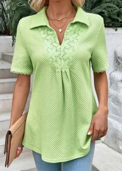 Light Green Patchwork Short Sleeve Shirt Collar Blouse