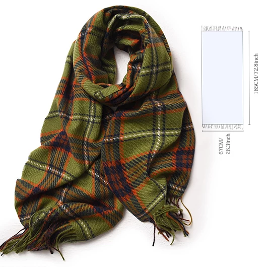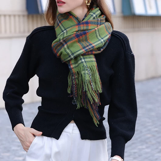 Olive Green Plaid Tassel Striped Shawl Scarf
