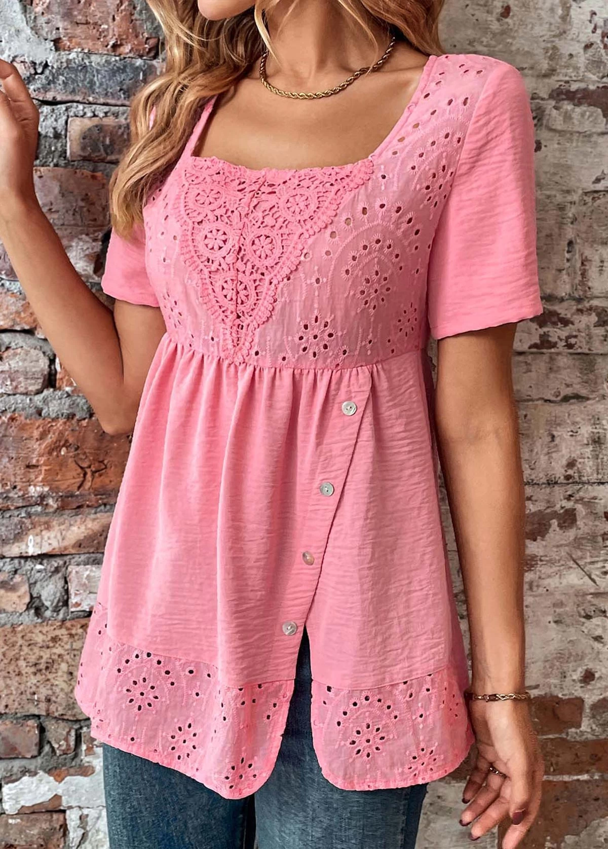 Pink Button Short Sleeve Square Neck Blouse