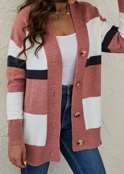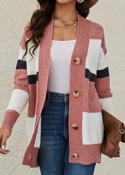 Pink Button Striped Long Sleeve Cardigan