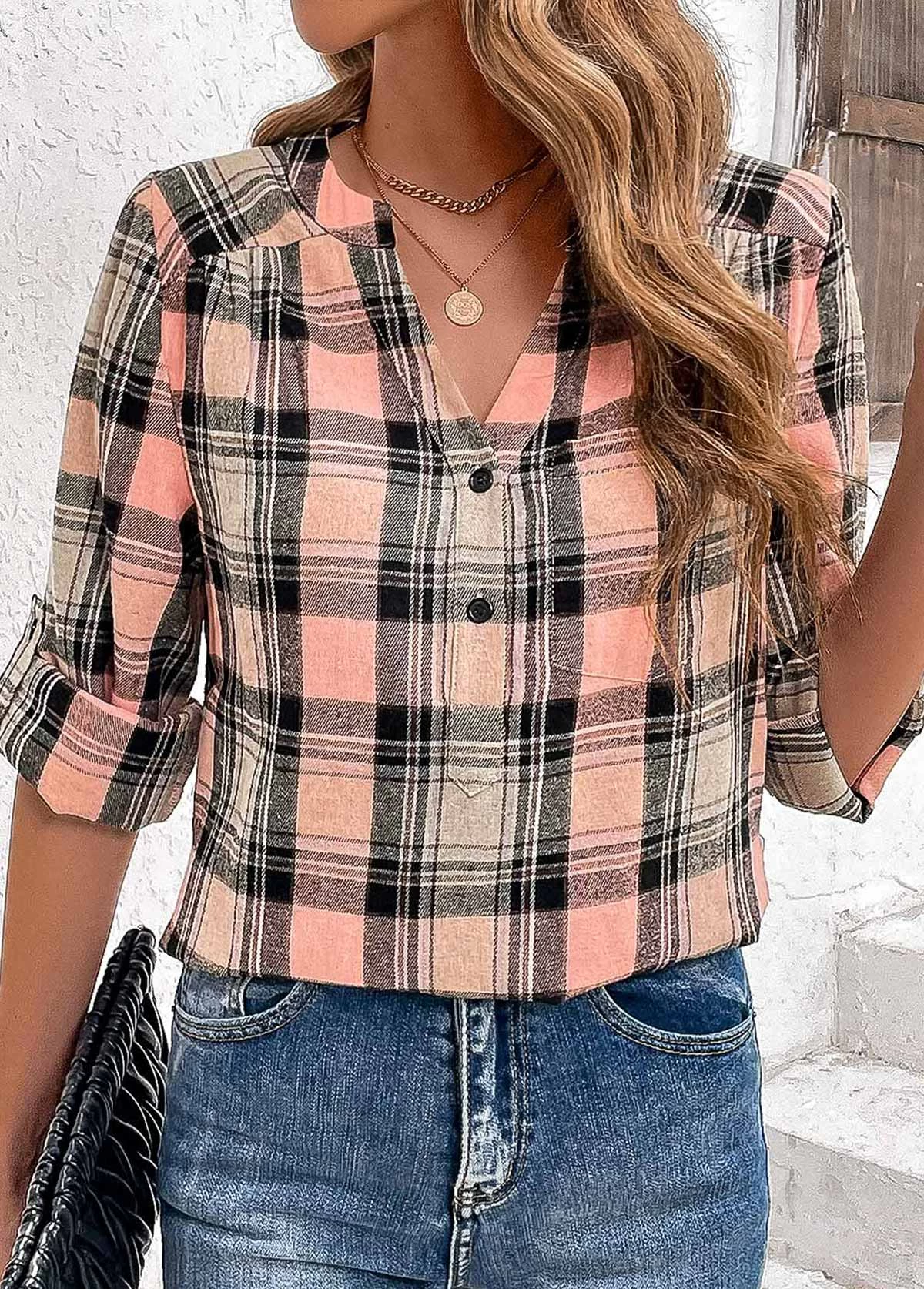 Be the first to review “Pink Ruched Plaid Long Sleeve Split Neck Blouse” Cancel reply