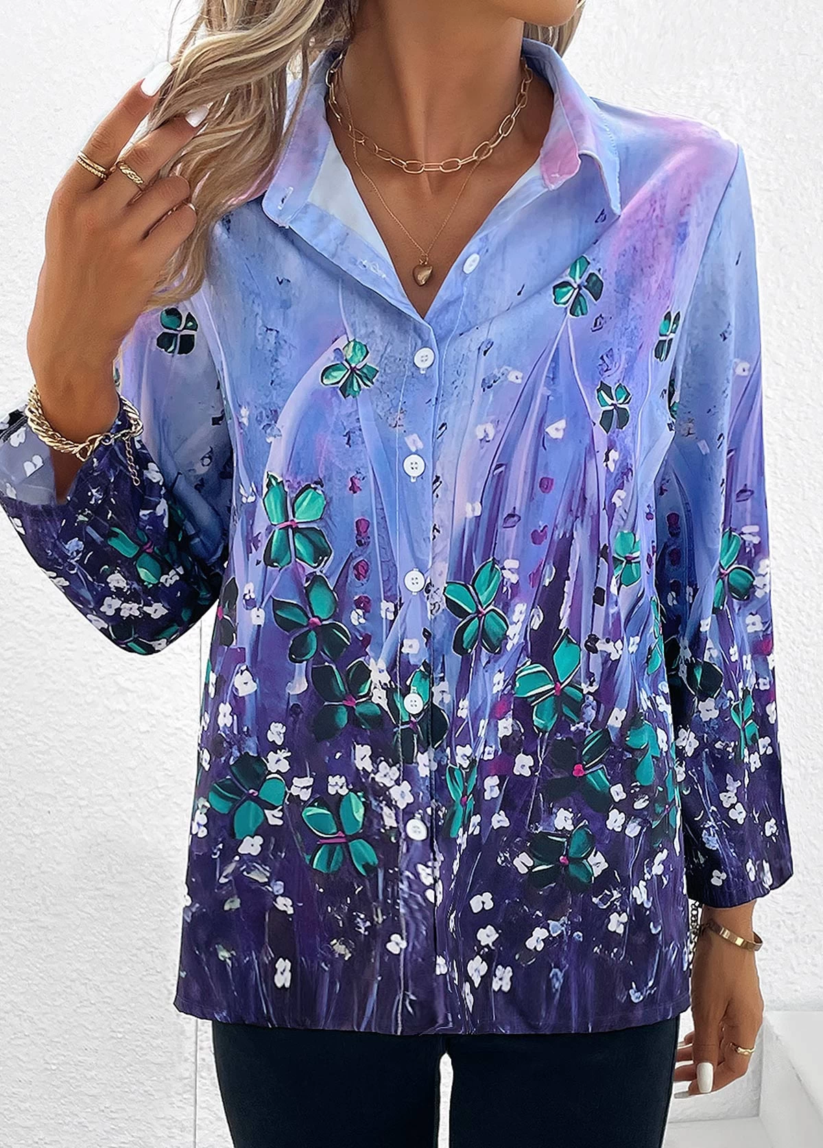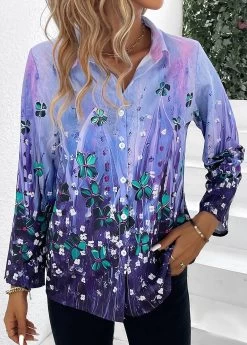 Purple Button Floral Print Long Sleeve Blouse