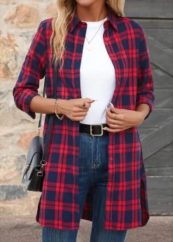 Red Button Plaid Extra Long Sleeve Shirt Collar Blouse