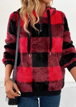 Red Pocket Plaid Long Sleeve Hooded Sweatshirt