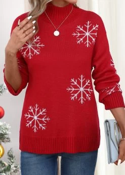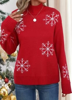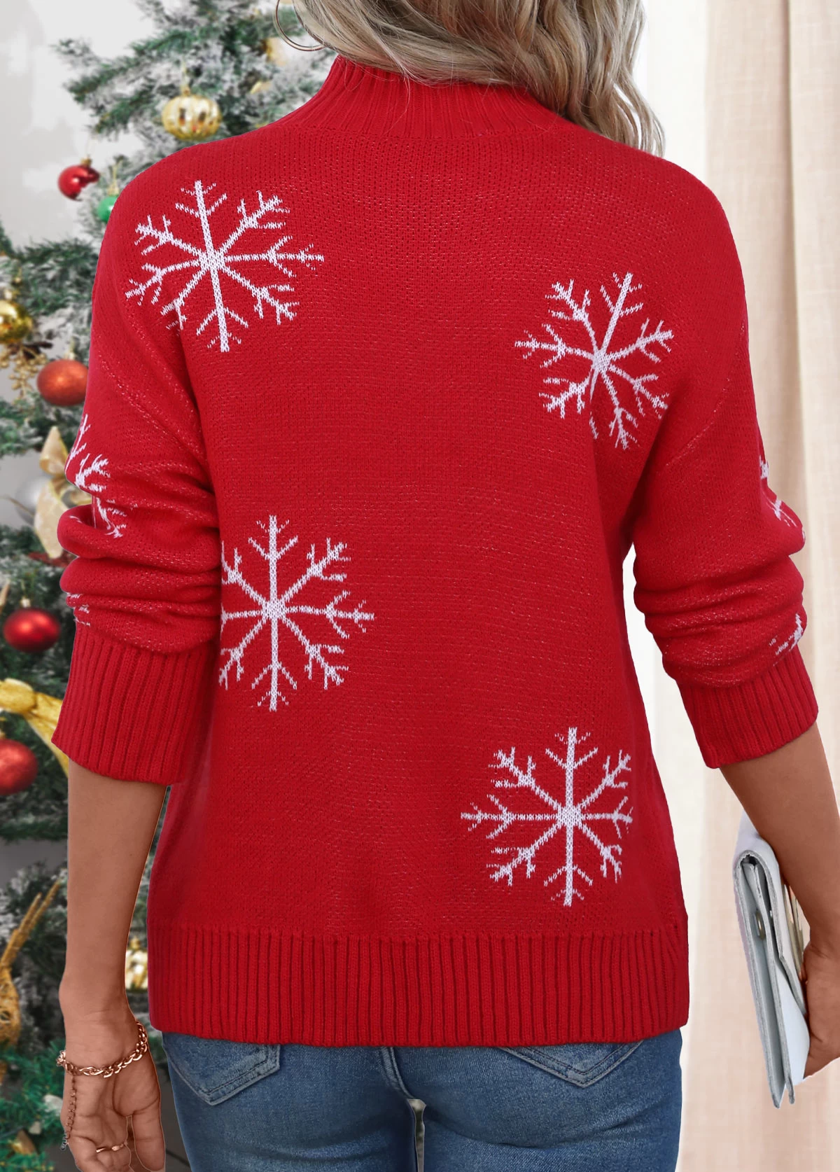 Red Snowflake Print Long Sleeve Stand Collar Sweater