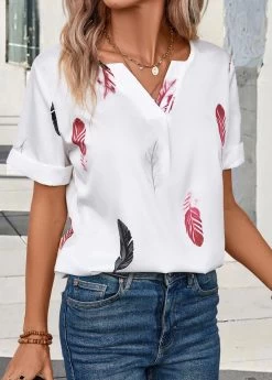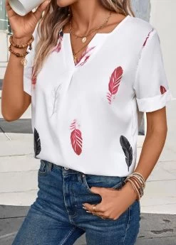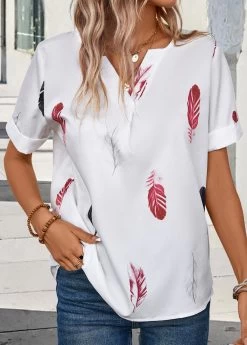 White Lightweight Feathers Print Short Sleeve Blouse