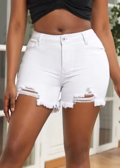 White Pocket Skinny Zipper Fly Mid Waisted Denim Shorts